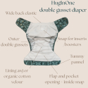 HugInOne er af typen All-In-One (AIO), hvor man skifter hele bleen ved hvert bleskifte. Fordi bleen både har en lomme og knapper, kan du vælge om det medfølgende indlæg skal ind i lommen (som en lommeble) eller være knappet direkte ind i bleen.